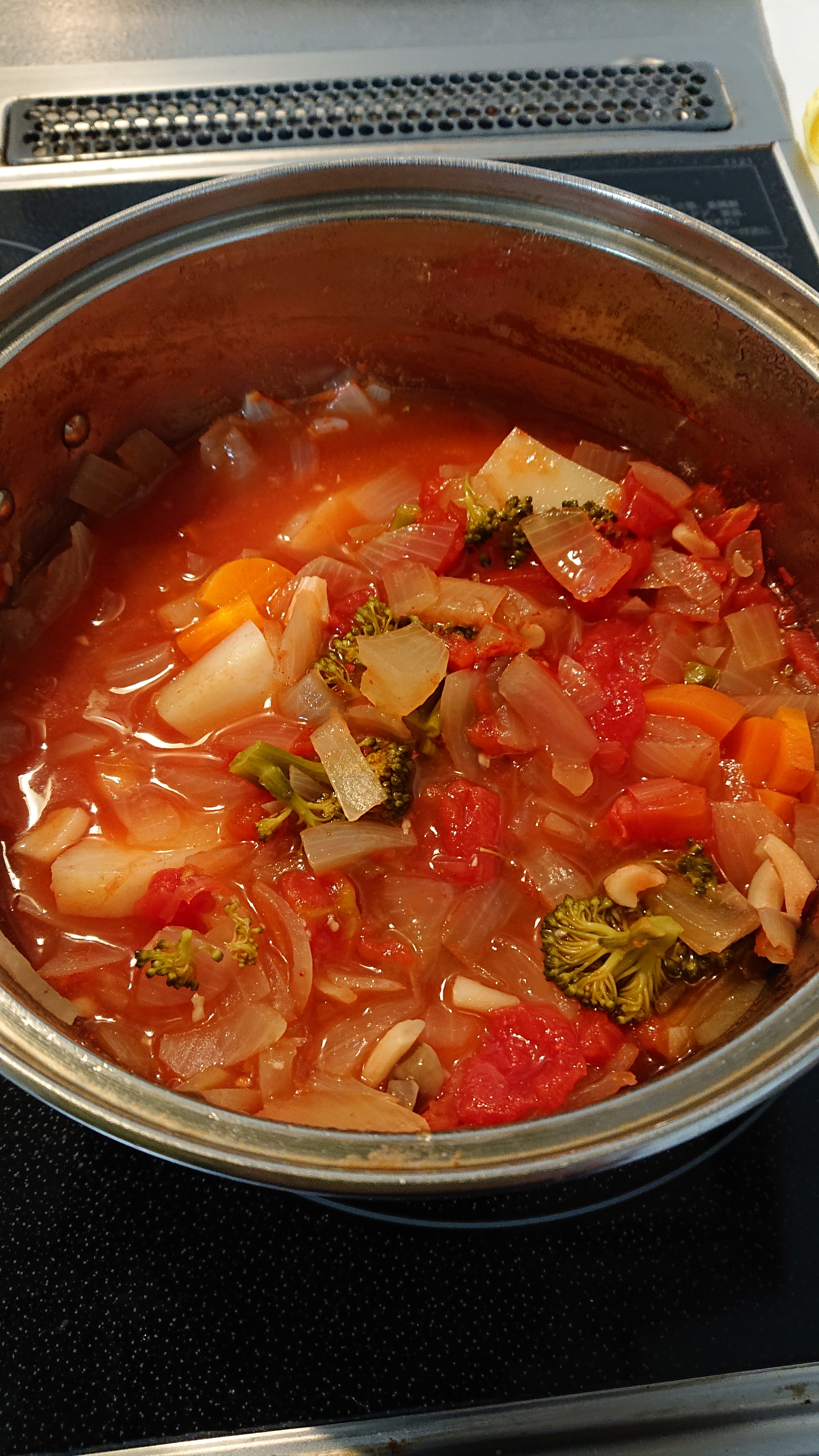 ブロッコリー、にんじん、玉ねぎ、じゃがいも、しめじ、トマト缶、ニンニクをいれて、コンソメで煮て完成。