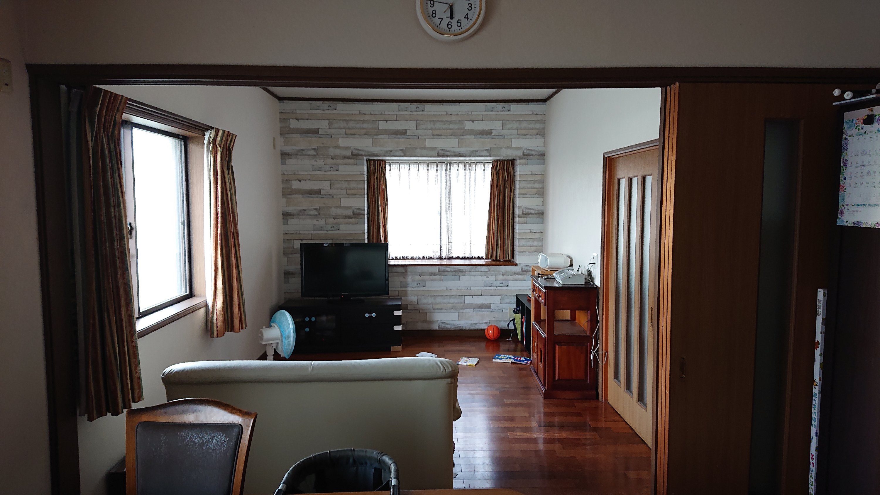 テレビがおいてある壁紙だけ、模様あり。他は白です。